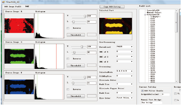 專利的RGB Tune功能通過單獨(dú)拍攝紅綠藍(lán)三原色照片并結(jié)合獨(dú)特的顏色過濾算法,完美的解決橋接誤判和相對(duì)基準(zhǔn)面不確定的問題,并同時(shí)提供2D/3D測(cè)量 結(jié)果和彩色的錫膏圖片,配合2D光源有效避免錫膏因紅光角度問題導(dǎo)致的RGB彩色效果失真; 不同基板顏色的RGB調(diào)試通用性更強(qiáng)大幅度提升設(shè)備的(高度, 體積,面積)重復(fù)性精度。